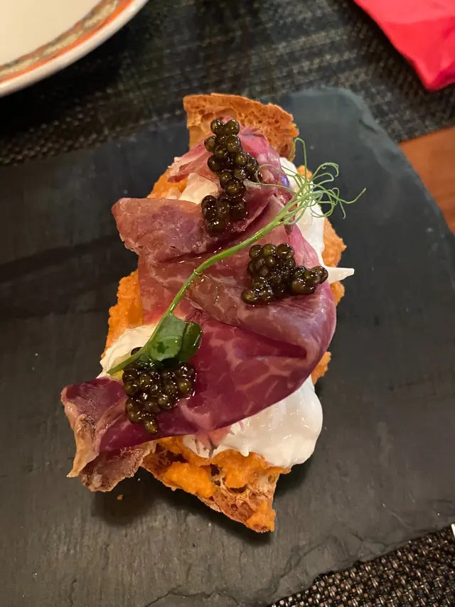 - **Rubia Gallega 風乾熟成肉多士伴魚子醬**——鹹香濃郁的熟成牛肉搭配魚子醬,層次豐富,是整晚最驚喜的一道!