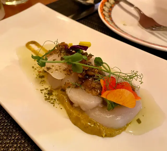 - **炙燒帶子配堅果蒜油醬** 油漬感過重,掩蓋了帶子的鮮甜。