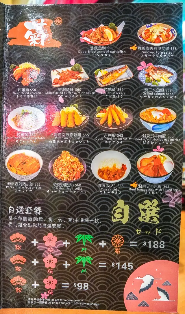 除左散叫,二/三/四人套餐之外,仲有自選套餐可以揀,喺 松、梅、竹、菊類別揀一款,咁就可以食得經濟D我同朋友揀左 自選套餐(松+梅+竹+菊)($188),包括左 雜錦拉麵($82)、串燒燒翼($35)、自家製吉列豬扒($48)、叉燒炒飯(大)($60),另外仲散叫左 日式芝士春卷(5枚)($32)、海鮮大阪燒($48)