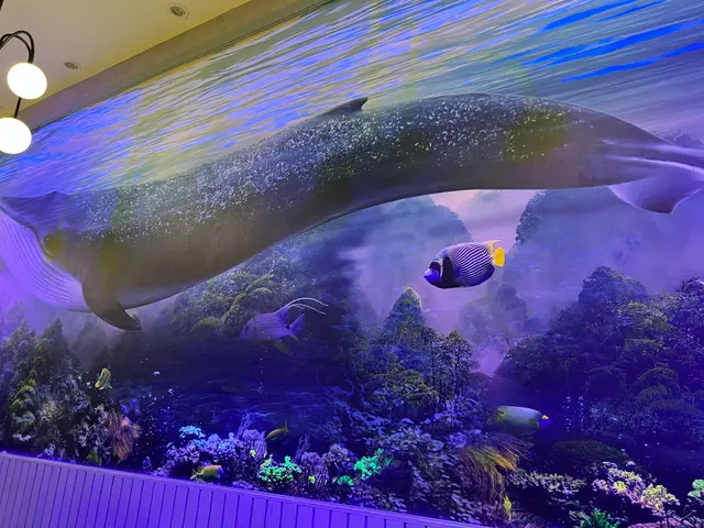 牆身整個貼了海洋底下的景圖, 有一條超大既鯨魚