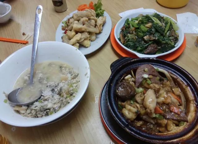 先嚟肉碎蠔仔粥,蠔仔幾算大粒,肥美,冇腥味冇潺, 裏邊有啲冬菜頭,加重個粥嘅鹹味,弼底睇落好似好少,過咗一陣啲飯粒浸起咗就好似泡飯咁,會滿啲,不過但凡係外面食有味粥感覺好似都落左雞粉。
