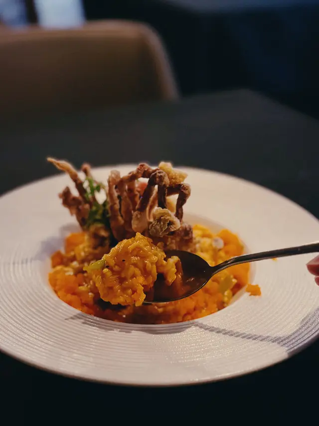 呢款意大利飯絕對係海鮮控嘅天堂💛 用上蟹黃熬製嘅醬汁香濃幼滑,配上炸得酥脆嘅軟殼蟹,內裡仍保留鮮甜蟹肉,意大利飯煙韌飽滿,吸收晒蟹黃精華,超級滿足🤤