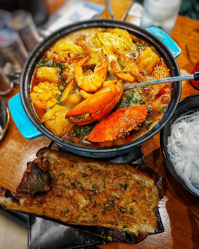配料豐富,有蔥、芫荽、肉蟹、魷魚鬚、花甲、蝦、鮑魚、萵笋、粟米、薯仔、金針菇、娃娃菜、豆卜。