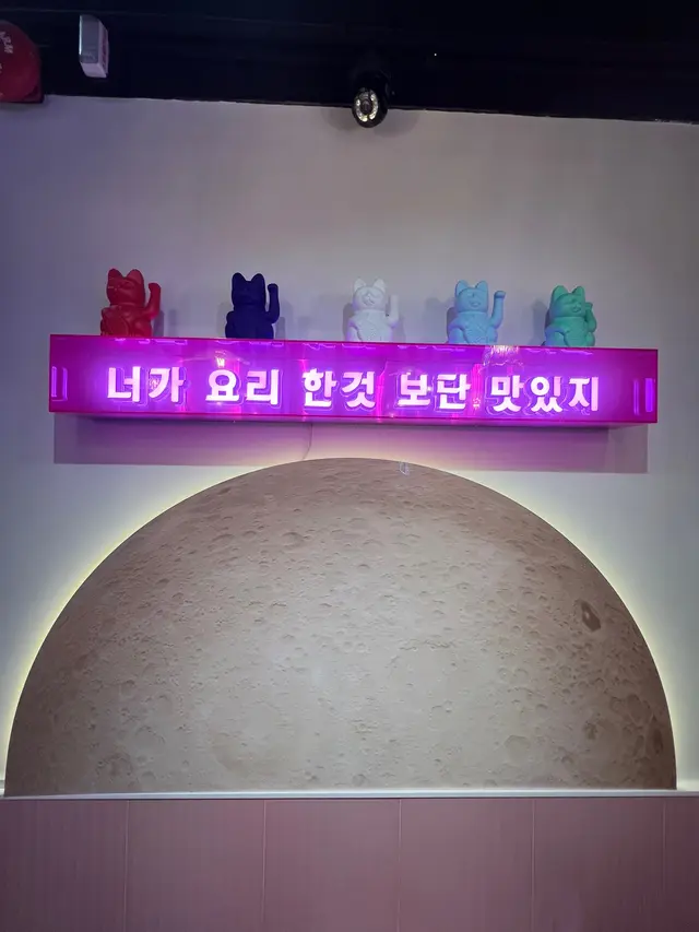 先講吓用餐前嘅感覺,餐廳雖小,裝修簡約,幾句韓語嘅霓虹燈管(即時用手機translate佢嘅意思😆)、電視播住當紅嘅K-pop MV,一排唔同顏色嘅招財貓有節拍地揮手迎賓,氣氛唔錯呢~