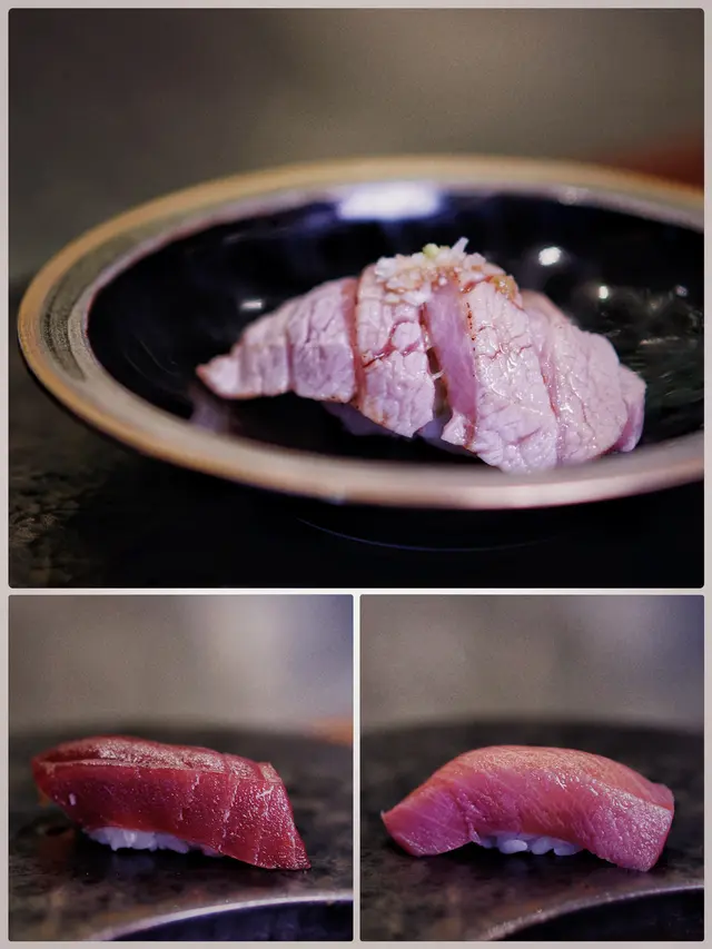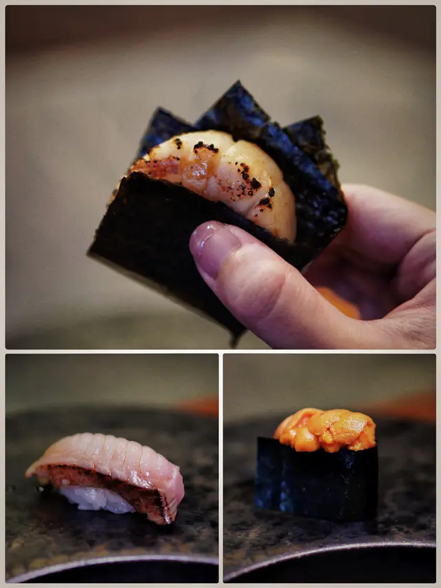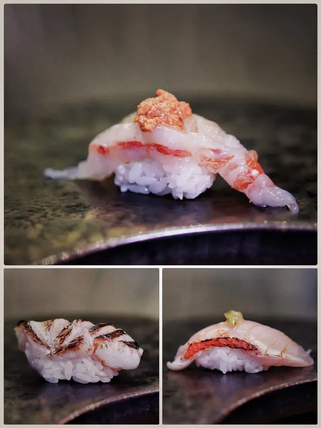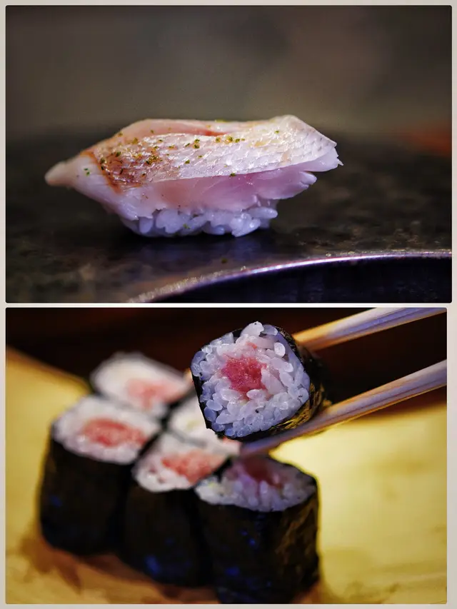 壽司方面,我們共嘗試了十款不同嘅壽司,分別係牡丹蝦、梭子魚、金目鯛、燒帶子、中拖、銀鱈魚、吞拿魚醬油漬、燒大拖,而最後嘅春子鯛和吞拿魚卷乃是檜嘅套餐先會有。每一件壽司都是由廚師即席製作,魚肉和飯的比例恰到好處,飯粒鬆軟而不散,魚肉鮮嫩而不腥。而其中最令我印象深刻的是牡丹蝦,蝦肉彈牙甜美,上面還有一層蝦膏,讓味道更濃郁;還有吞拿魚醬油漬,魚肉經過醬油浸泡,色澤深紅,入口即化,油香四溢。