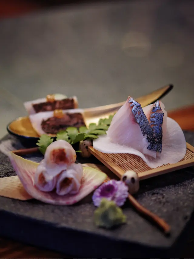 刺身三品係柏套餐專屬,入面有左口魚、池魚和太刀魚,每一種都切得厚實而不失嫩滑。左口魚捲住柚子酸汁啫喱和薑絲一起吃,讓原本淡雅的魚肉多了層次和清新感;池魚則是用生姜汁拌過,保留了原汁原味的爽口;太刀魚則是用火灸過表面,逼出油脂,香氣四溢。