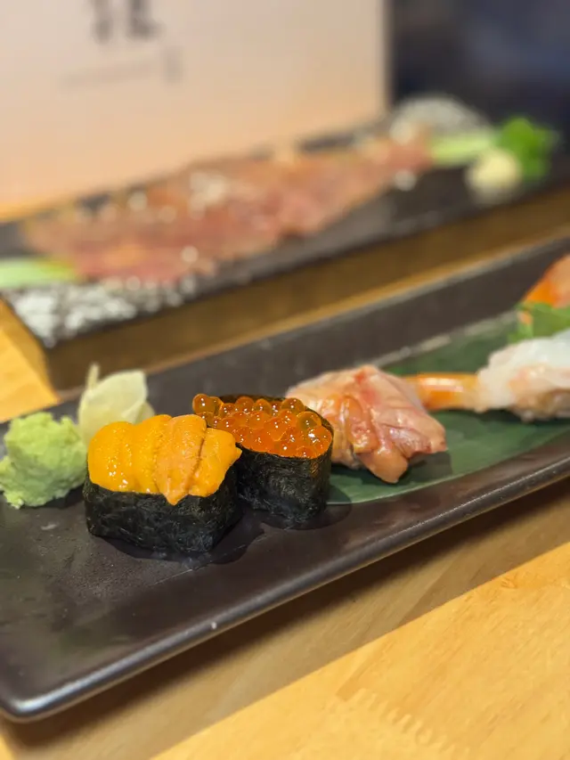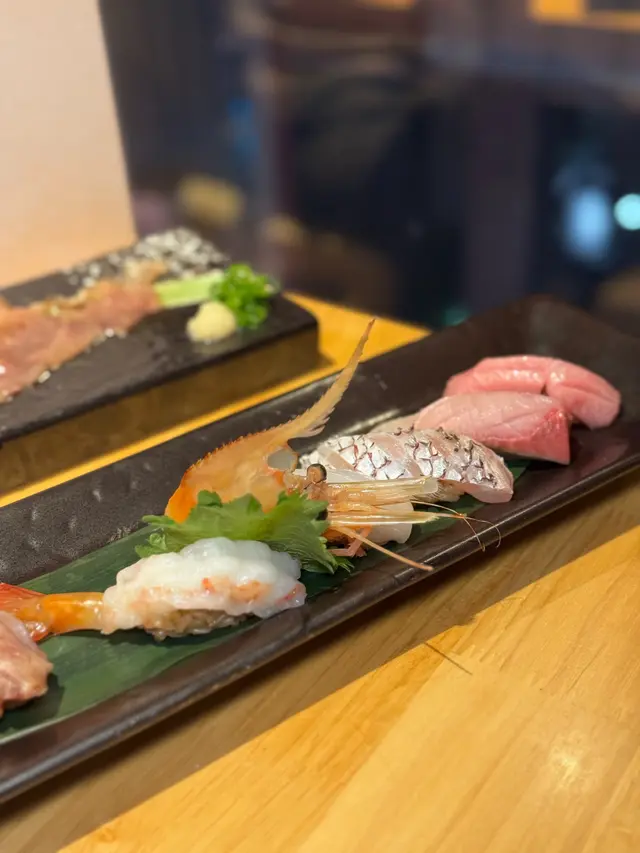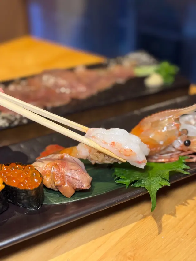 漁獲壽司盛好豐富~海膽、呑拿魚腩、牡丹蝦、三文魚籽、油甘魚、旬之魚、紋甲魷魚同赤貝。最愛呑拿魚腩!富天然魚油脂的甘香,入口即溶🤤🤤除咗刺身壽司🍣推介火灸A4和牛壽司,店員即席用火槍燒,和牛經炙燒後更添油香啊