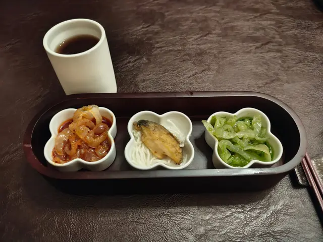 在我們的用餐中,我們點了餐廳的嚐味套餐,開始這場美食之旅。套餐首道是三小碟小食,包括椒鹽糖心鮑魚和鴛鴦海蜇絲。椒鹽糖心鮑魚色澤金黃,鮑魚表層酥脆,中間卻保持了其鮮嫩的質感,鹹香的椒鹽為其增添了獨特風味。而鴛鴦海蜇絲則為一道清爽的開胃菜,海蜇的脆感搭配特製的醬汁,清新又開胃,是開場的完美選擇。