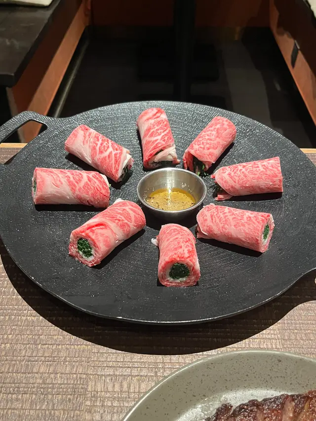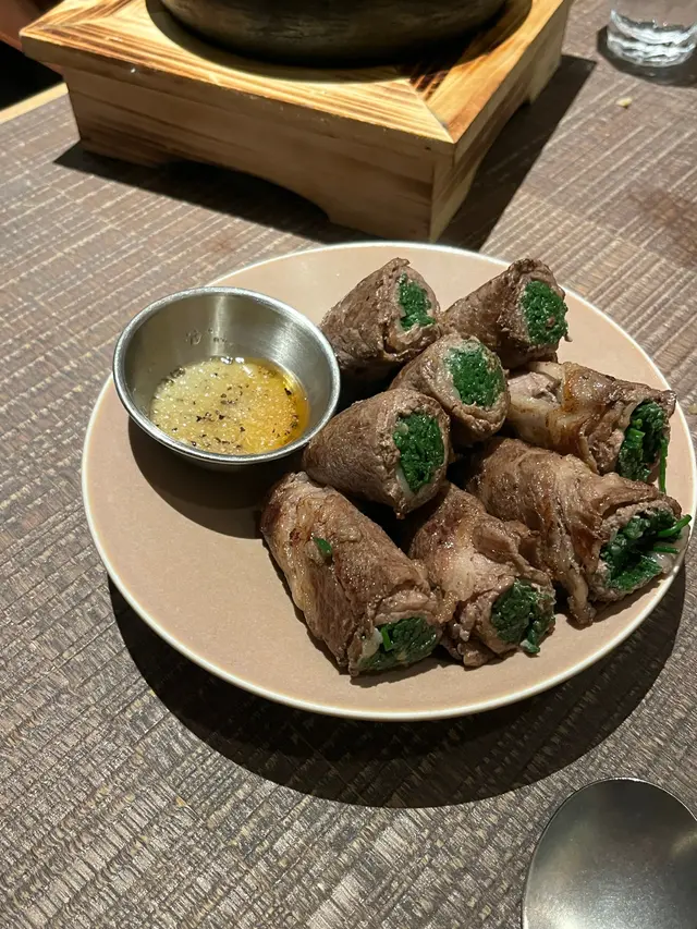 不愧係韓牛,牛味非常濃郁,但當然都幾油膩😂 食兩件其實都飽左😋建議多人share! 裡面包住左沙葱口感變得更豐富,啲蔥索滿了肉汁同油脂,所以每食一件都一口爆汁➕爆油😍 另外亦都配左款韓式油鹽沾碟提味,牛味再次昇華👏