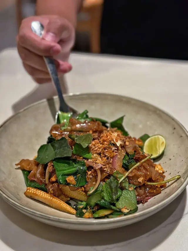 食完咁多肉,要啲澱粉質同蔬菜平衡下。我哋叫咗個「泰式炒素闊河粉」。呢啲炒粉麵飯最考師傅功夫,就係睇個「鑊氣」。碟河粉一上枱,熱辣辣,豉油嘅香味好出。闊河粉炒得乾身,條條分明,唔會黐埋一舊,而且夠晒煙韌彈牙。雖然係素食,但用料一啲都唔馬虎,有唔同種類嘅新鮮蔬菜,食落好清爽。味道甜咸適中,唔會太重口味,作為肉食之間嘅緩衝,表現相當稱職。👍