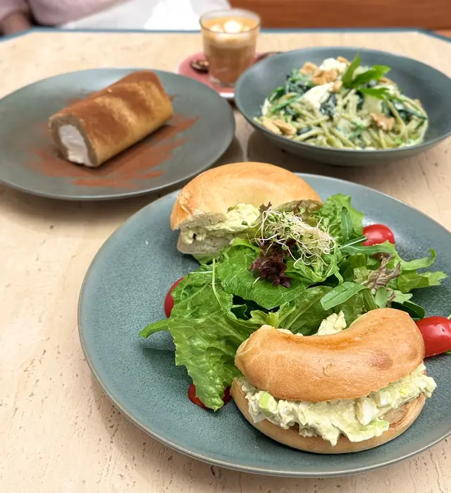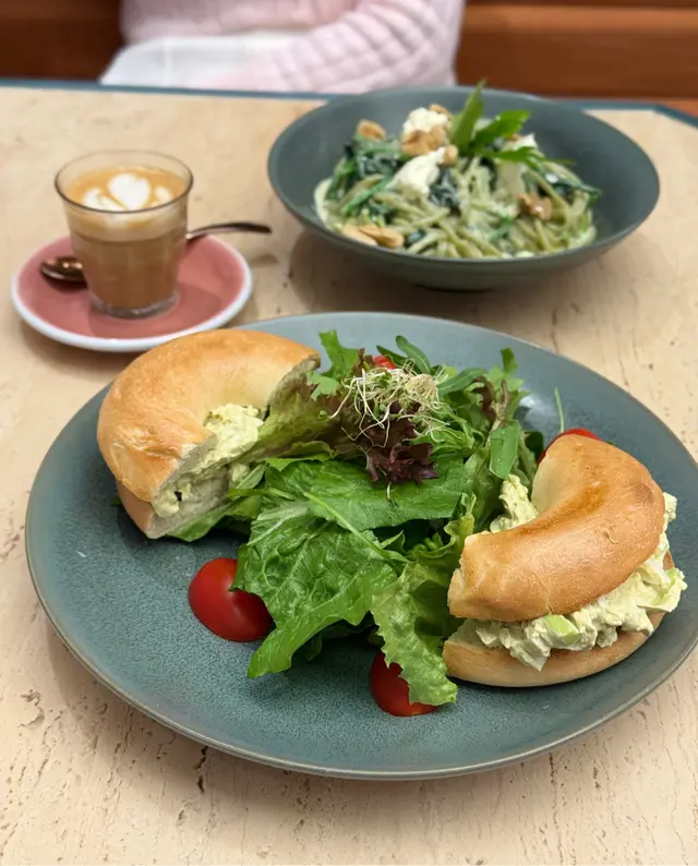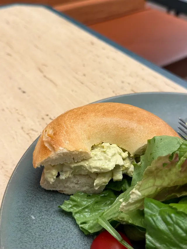 貝果烘至外表脆脆哋,裏面夾住滿滿嘅牛油果蛋沙律,旁邊仲有沙律菜,係清新嘅輕食之選~