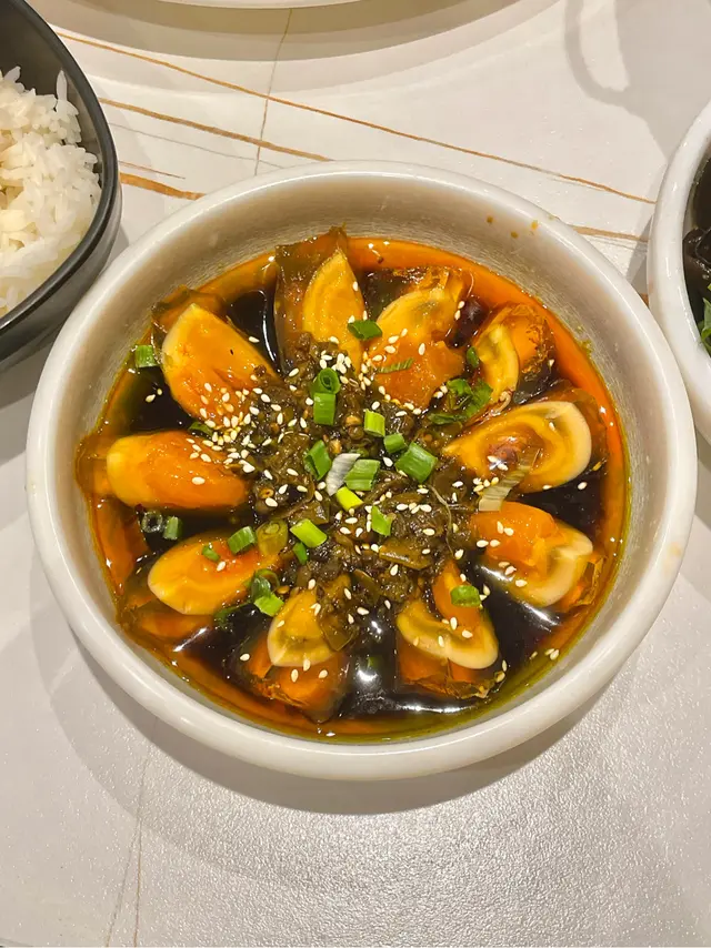 青椒皮蛋(單點$38),表面鋪有芝麻、香蔥,採用黃金皮蛋製作,皮黃蛋白晶瑩剔透、蛋黃口感溏心,蛋香味濃,配以梅菜、自家製醬汁食用,味道鹹香,略嫌沒有青椒、辣味欠奉。