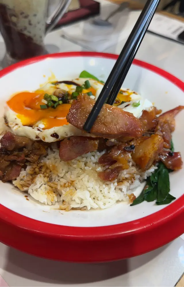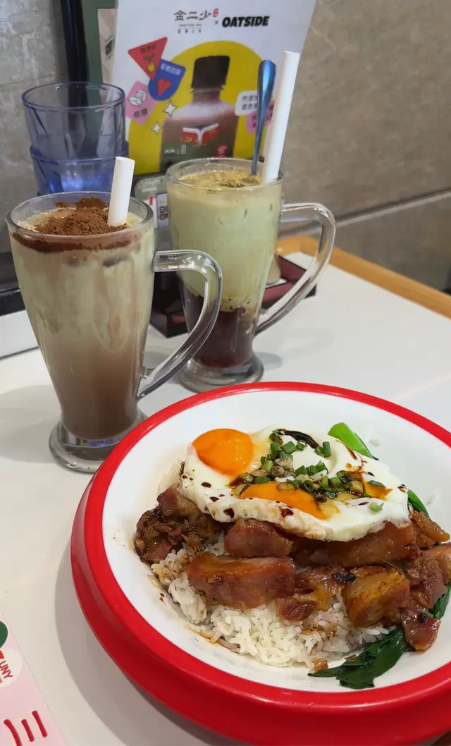 金二少選用精瘦叉燒肉,燒得邊緣微焦,食到蜜糖甜香同炭燒風味。🔥 肉質鮮嫩多汁!😋 搭配金黃流心太陽蛋,戳破蛋黃,濃郁蛋液緩緩流出!🤤 再淋上特製甜豉油,鹹甜交錯,更增添了層次感!🤩 絕對係令人一試難忘既經典之作!💯 唔食會後悔!😭