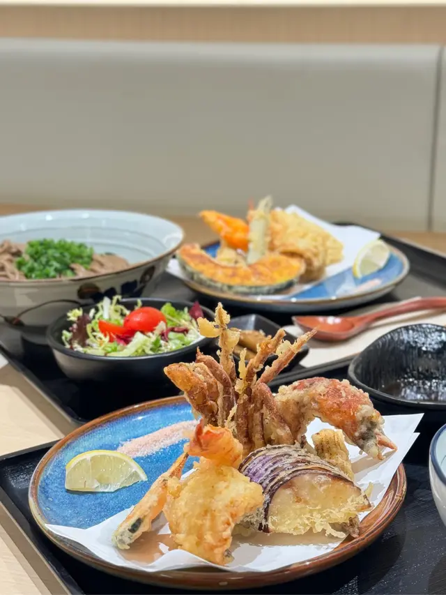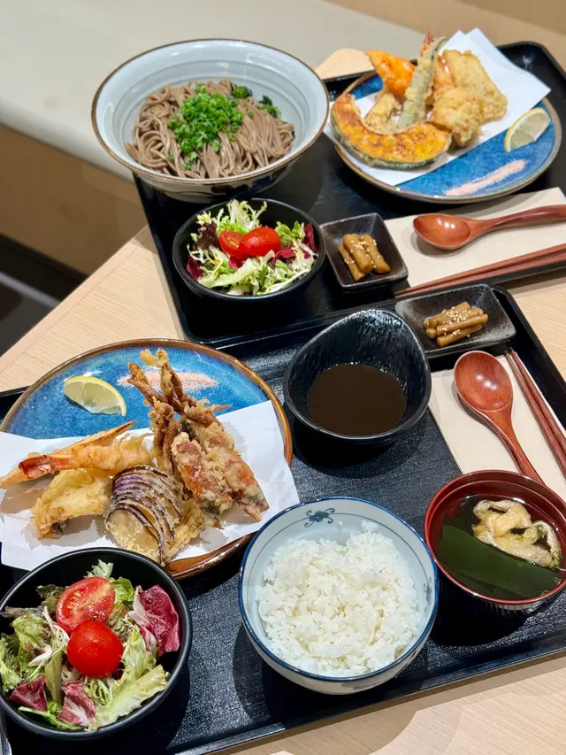 蕎麥麵🍜麵條彈牙,有柚子酸甜味道,口感清爽。拼盤有數種海鮮和蔬菜天婦羅:虎蝦、鰻魚、墨魚、蟹柳、粟米芯、南瓜及秋葵。