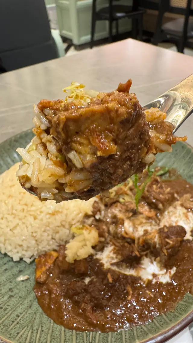 「仁當牛肉配雞油香飯」:Rendang 嘅起源好有爭議性尤其是如果你問馬來西亞人同埋印尼人佢哋嘅答案應該會好唔一樣🤣,有興趣可以自己上網睇睇🤣,點都好啦 Rendang 喺星加坡、馬來西亞、印尼、汶萊等地都非常流行🤣;呢間餐廳嘅 Rendang 牛肉炆煮得幾軟熟,配雞油飯一齊食仲有啲啲特別添🤣