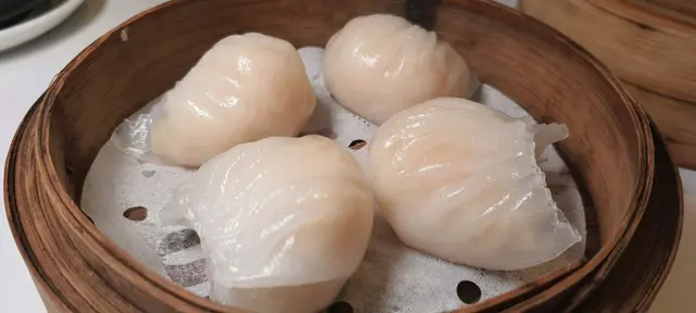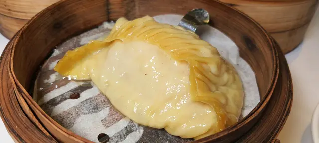 跟着來的是灌湯餃,竟然在此吃到小時才可吃的灌湯餃,雖知現在各大小及連鎖酒樓,所謂的灌湯餃根本是浸湯餃,只是酒樓巧立名目收取高價,因灌湯餃是高成本,點心師傅少點功夫也做不到,那些酒樓做的不三不四的浸湯餃本人從來没有興趣吃。小孩時當灌湯餃放上枱時,細路總小心奕奕將湯餃放於碗內,因若不小心弄穿餃皮,好運剛好放在碗內就仍可吃,否则那餃內的湯和餡料全瀉於枱上,就全報癈只可看其它人吃,也算是小童於酒樓內一