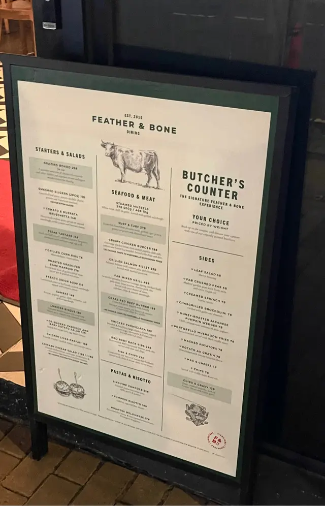 穀飼牛臀肉、香腸、燒春雞(半隻)、豬扒、牛骨髓和慢煮豬肋肉。搭配醬汁、涼拌菜、薯條和烤酸種麵包。