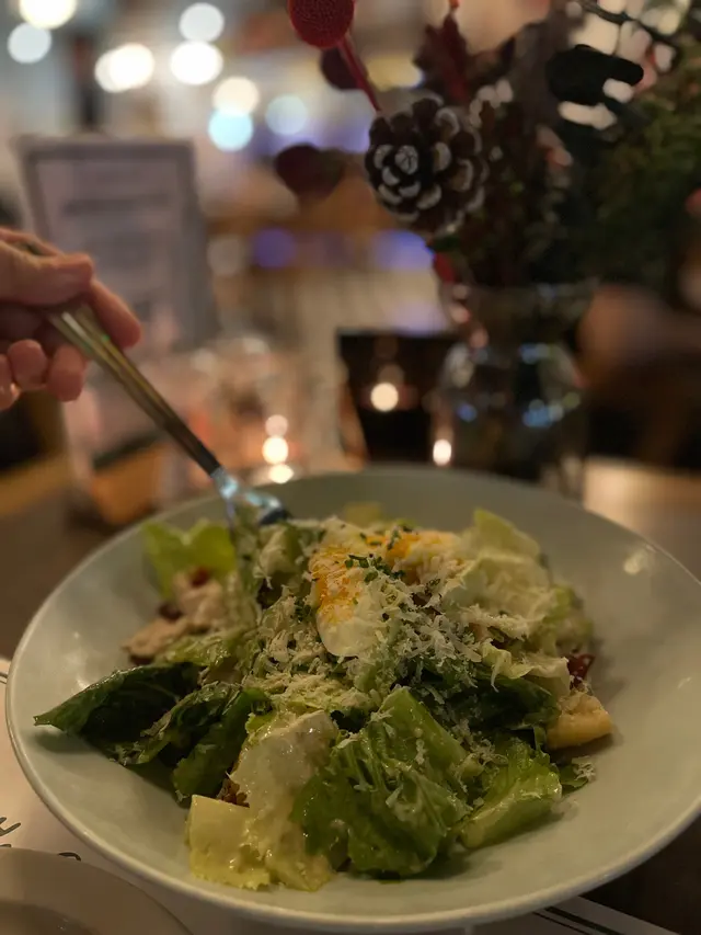(水煮雞胸肉、羅馬生菜、煙肉條和五分鐘半熟蛋、拌以鯷魚沙律醬)