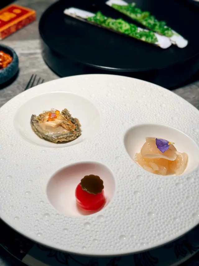 以20年花雕酒浸鮑魚,佐以花雕啫喱凍,味道甘香醇厚,鮑魚爽口彈牙,梅子蕃茄酸酸甜甜上面放上昆布,三款前菜都唔錯
