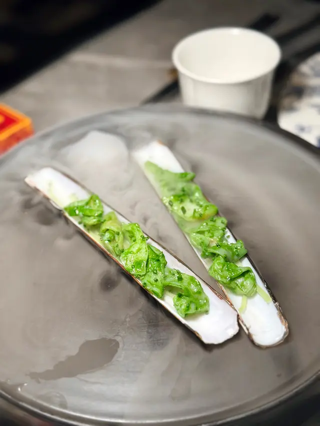 藤椒加蔥油塗上蟶子肉,味道清爽醒胃,蟶子下面仲放左萵筍絲,入口清甜