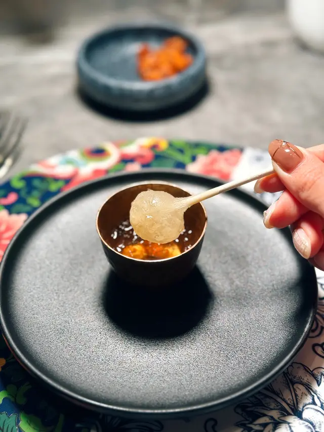 雪白嘅珍寶帶子配上蟹肉絲同豆腐,入口細嫩,軟綿綿,表面放上黑醋魚籽,帶點酸甜鮮味,好開胃