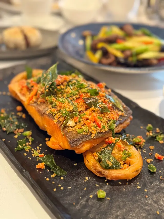 將三文魚煎香,但能保持三文魚肉質非常鮮嫩,入口非常之滑,絕對係一試難忘! 食得辣嘅一定要連埋上面避風塘配菜一起吃,又可以引發不同味蕾嘅刺激🔥!