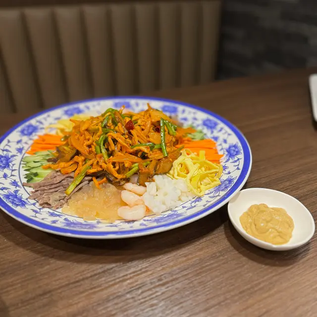 肉絲兩張被簡單啲嚟講其實就係中式嘅撈起😚成個擺盤都好有中式嘅感覺🥰佢有好多配菜同肉絲😛要逐樣逐樣講佢出嚟都唔係咁容易🤣佢哋用咗青瓜🥒/紅蘿蔔絲🥕/海蜇🪼/魷魚🦑/蟹柳絲/蝦仁🍤/中間有肉絲洋蔥🧅炒埋!重點係黃色芥末醬!點綴晒成個撈起☺️但小編就有一個忠告俾大家建議可以逐少逐少咁加落去(如果唔係就會好似我咁攻鼻🤫)