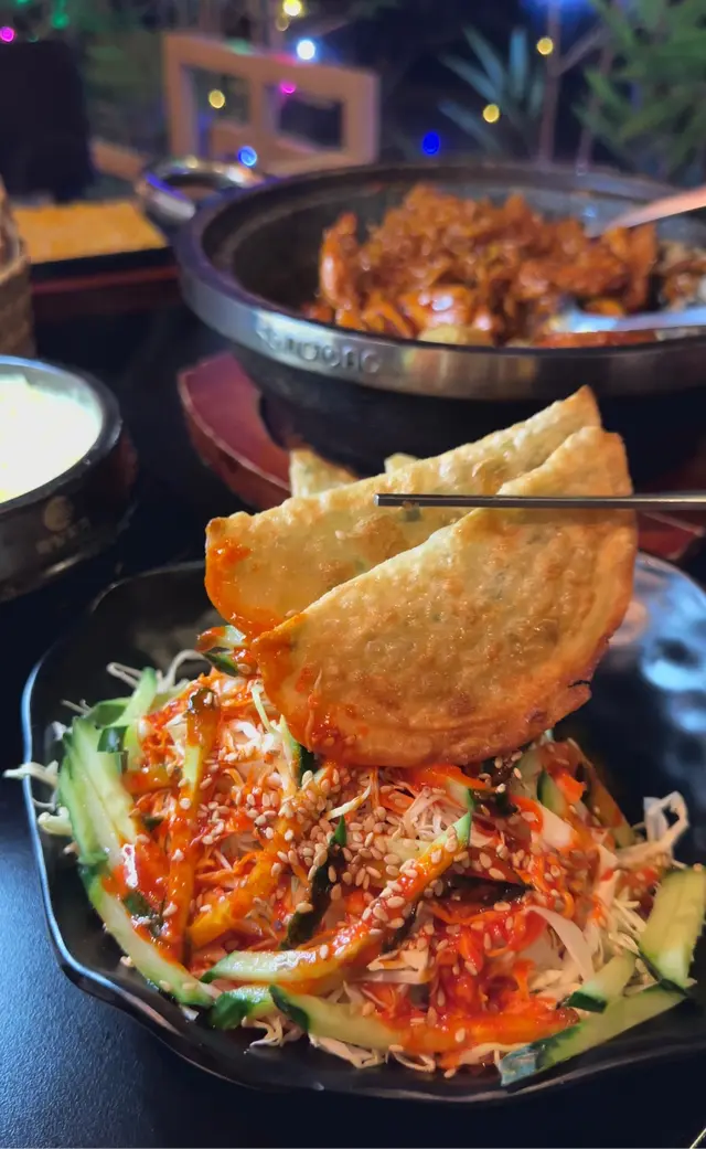 清爽椰菜絲同青瓜配上韓式醬汁,口感獨特,薄薄餃子皮有4塊🤗放上炸得香脆餃子皮一齊食🤗唔錯!