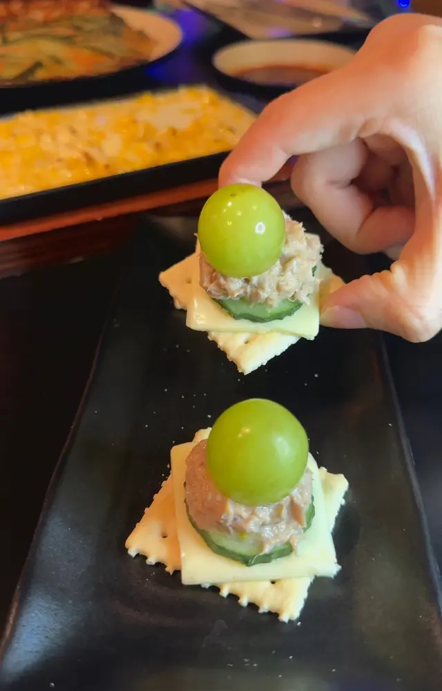 呢個組合幾特別!平時都係牛油果牛肉他他/吞拿魚他他!吞拿魚芝士梳打餅配提子真係第一次食😜 酥脆梳打餅乾上,鋪滿香濃芝士同鮮美既吞拿魚碎😙再點綴上酸甜可口青提☺️好清新!估唔到咁夾!非常特別🤪