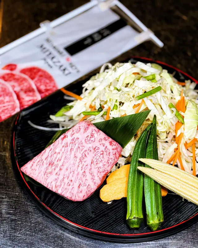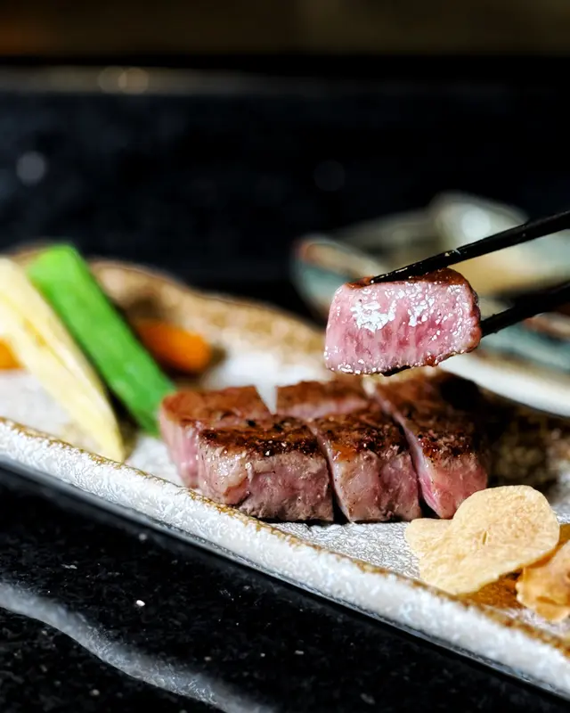 60克厚切的霜降和牛在鐵板上舞出油花交響曲。表面烙上完美格紋,切面呈現誘人的粉紅漸層。入口那刻,豐沛肉汁與融化的脂肪形成天鵝絨般質地,喉間留下堅果與奶香的奢華餘韻。