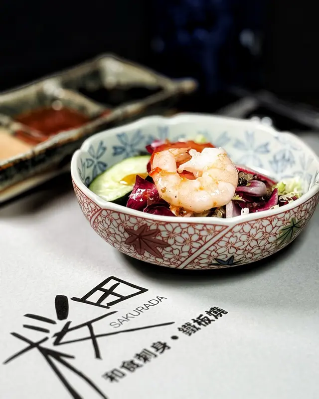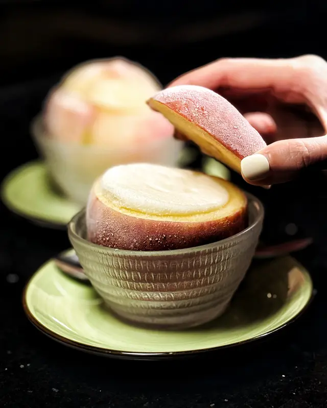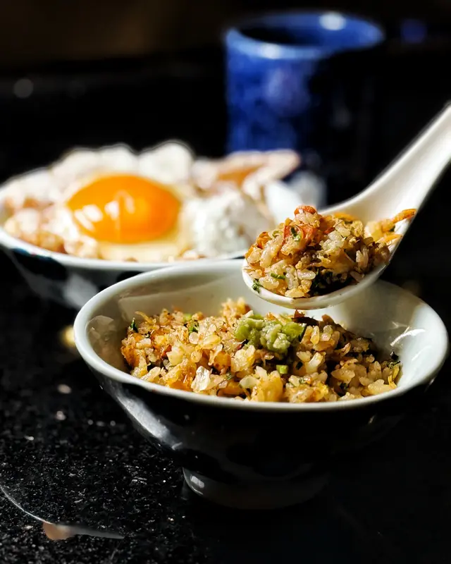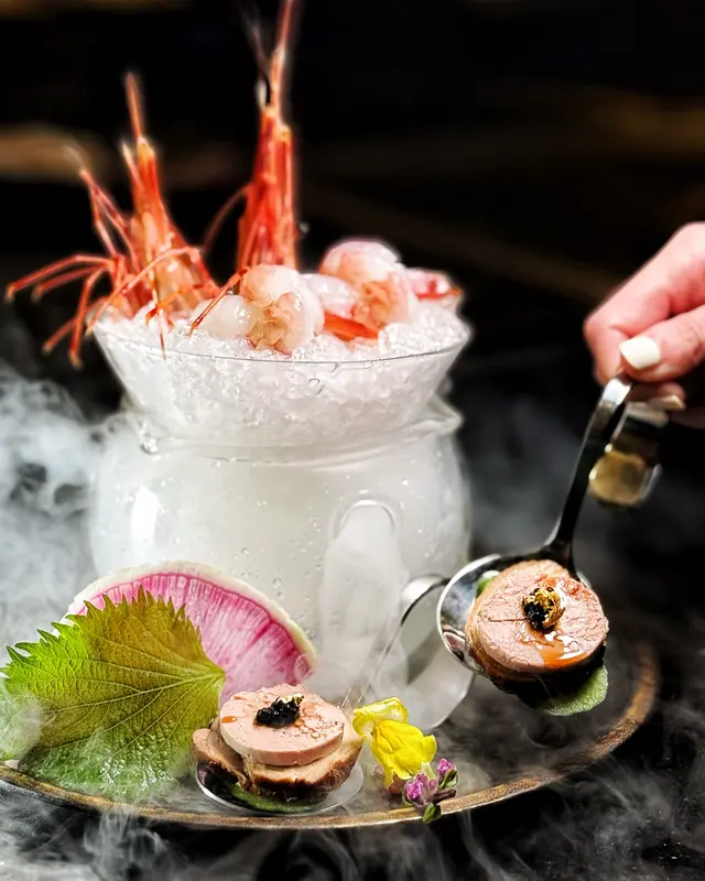 前菜三色藜麥海老沙律以番茄汁提鮮,宮崎雞肉卷佐鴨肝醬展現法日融合創意。甘鯛立鱗燒的鱗片如金箔般酥脆,搭配柚子豆乳湯更顯高雅。收尾的山葵炒飯以微辛喚醒味蕾,最後以雪葩的冰涼清甜畫下完美句點。