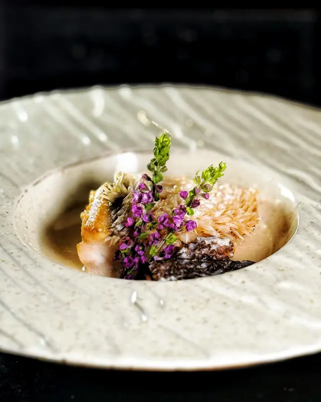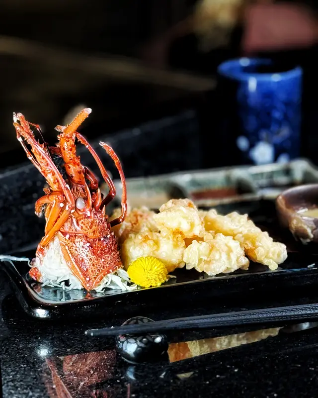主廚嚴選未成年的乳龍蝦,裹上輕盈金衣現炸。半透明蝦肉透著珍珠光澤,咬下先是酥脆聲響,繼而湧出帶著乳香的甘甜汁液,尾韻縈繞淡淡海潮香氣。