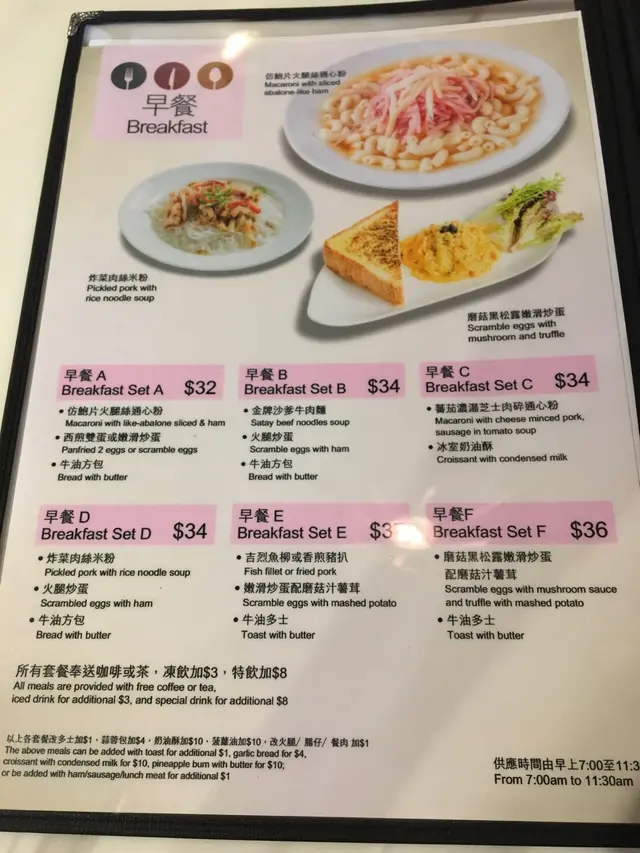 坐下後翻揭餐牌,看到營養早餐看似不錯,$28包鮮奶麥片和吞拿魚生菜三文治。誰料那天沒有營養麥片,便打算轉叫雙拼三文治餐。
