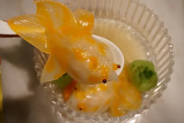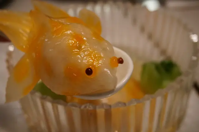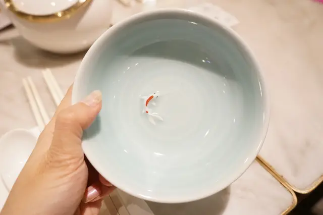 如魚得水($99/2件)置放在玻璃盤上,真箇是「如魚得水」的意境。漲鼓鼓的金魚以餃皮搓成,魚鱗紋理清晰可見,抹上淡淡的金粉,細緻度高。以匙子舀起,金魚靈動得很,很唯美。如此美態自是顧此失彼,外層餃皮略顯乾身,幸而漲滿的餡料令口感豐盈,肉餡當中有海蝦、斑肉、甘筍粒,並以香芹、莞茜提升香氣,頗得我心。眾多的通點心當中,要數這對小金魚最維肖維妙。