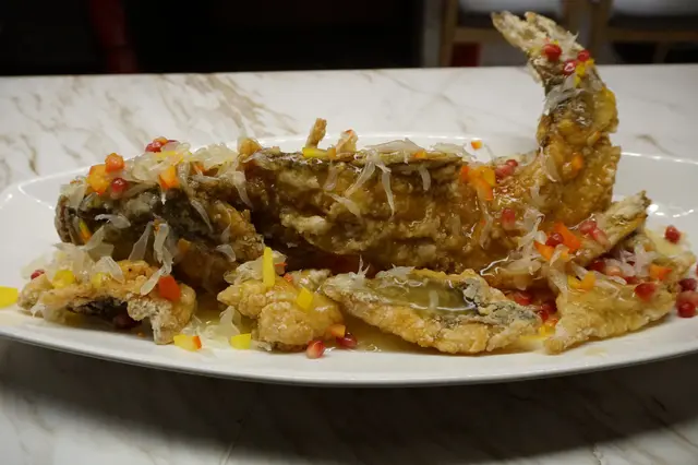 鯉躍龍門($239)以原條鱸魚呈上,足有二斤重極有份量,上桌時甚具霸氣。香炸過的鱸魚魚皮酥脆香口,魚肉鮮嫩但魚味稍欠。原條酥炸起件的關係,厚身的魚柳啖啖肉的,配酸酸甜甜的石榴子和香檳汁同吃,感覺十分開胃滋味,連不愛吃魚的小孩也吃得津津有味。
