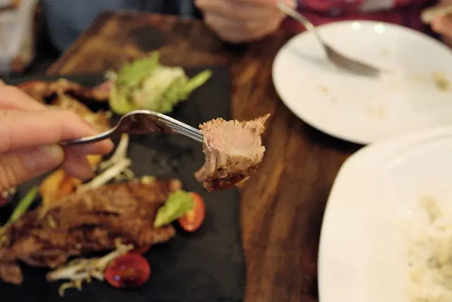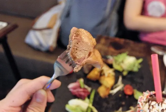 這個美國肉眼牛扒跟平時吃的有點不同,在碟上的牛扒並不是一整塊上碟的,而是被廚師切成了一條一條的牛柳條,感覺有點奇怪,廚師為甚麼要這樣做呢?