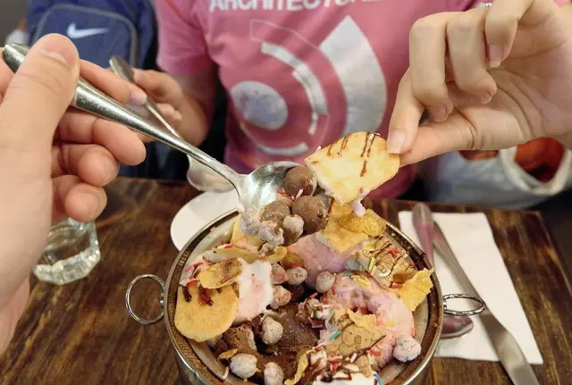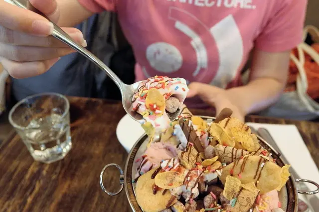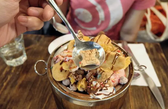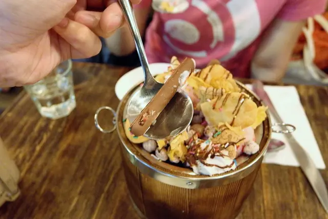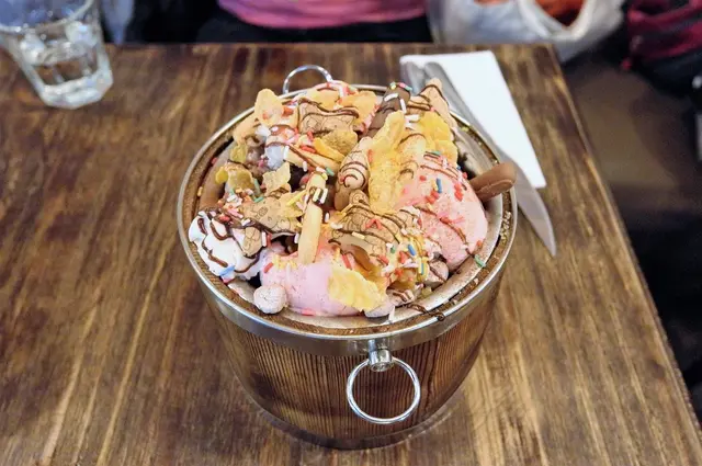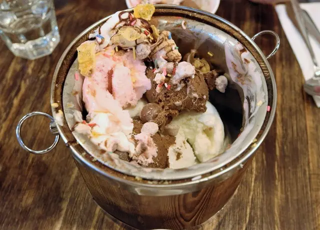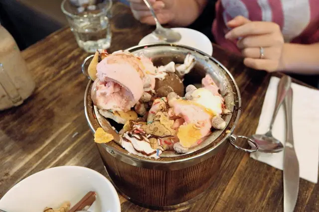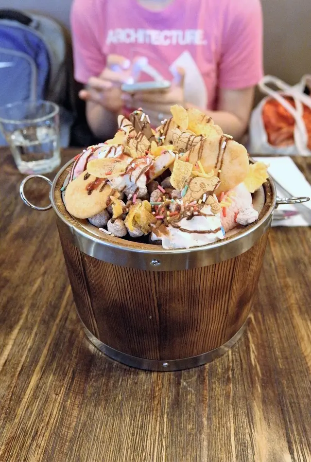 等了一會之後,Waiter將一整個木桶放在Step和娘子的眼前,實在令我們眼前一亮,雪糕加上各式各樣你想得到的脆脆,如朱古力熊仔餅、薯片、旺旺、朱古力手指餅、麥提沙等,皆放在這個木桶之內;而雪糕則是三色雪糕,分別是士多啤士味、朱古力味和雲呢嗱味,每款皆有2球的份量。
