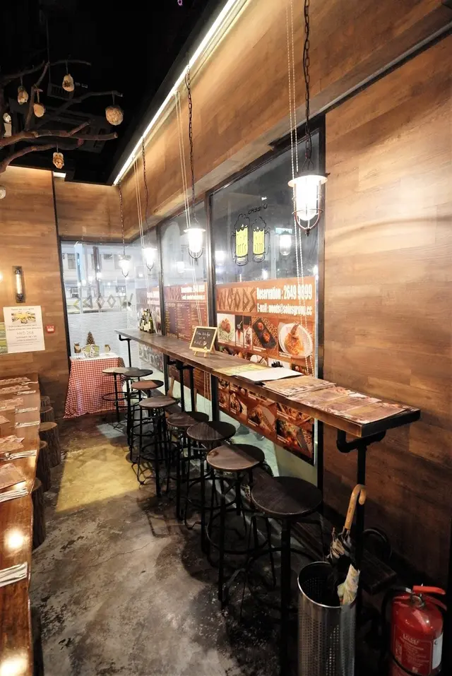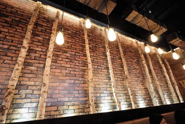 主題牆用了紅磚砌成,還加了一支支木柱由下而上屹立著,令冷冰冰的紅磚牆滲出木的原素;