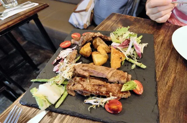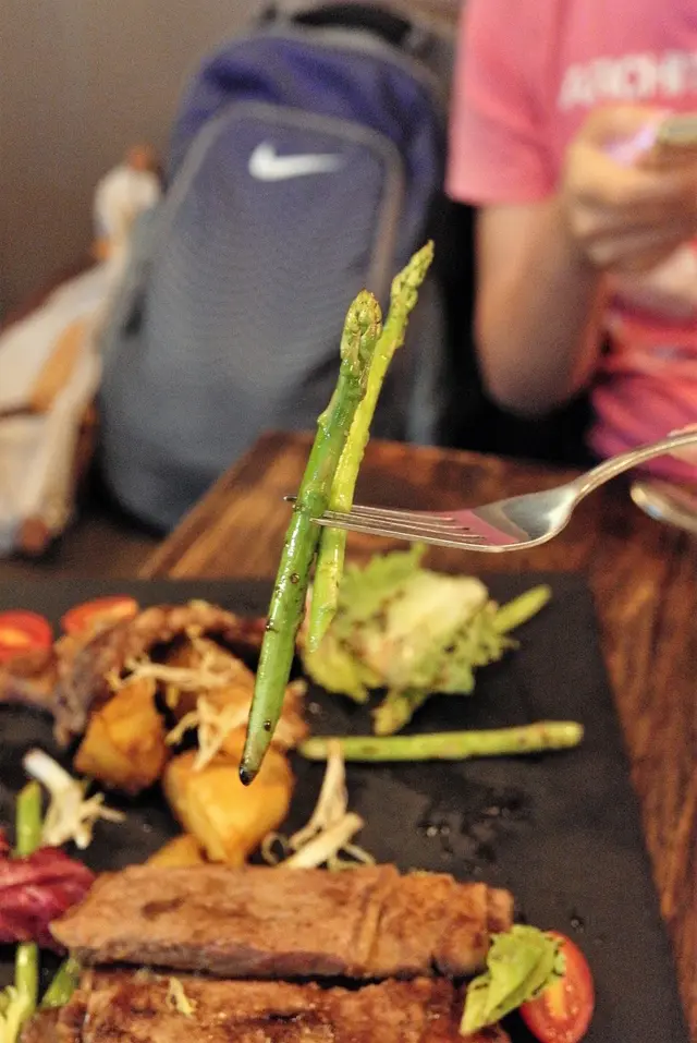 整份美國肉眼牛扒廚師巧妙地擺放成三層,第一層就是鋪在牛柳表面的蔬菜沙律,包括有椰菜、生菜、車厘架和露荀,好讓客人在吃牛扒前先吃一點蔬菜,有心思;