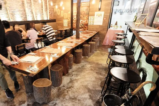 中間部份就是一張可座十六人的原木製成的長檯,長檯的中央部份被大樹貫穿,也可能這樣的關係,這裡的木櫈用上了木年輪櫈,也將整間餐廳以木的主題帶致高潮呢!!