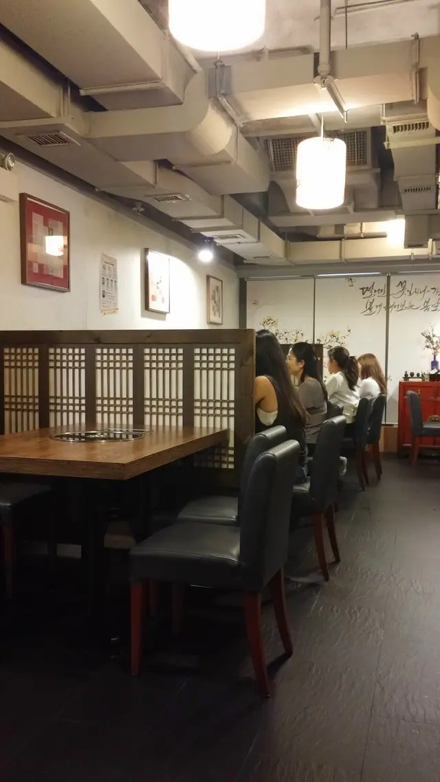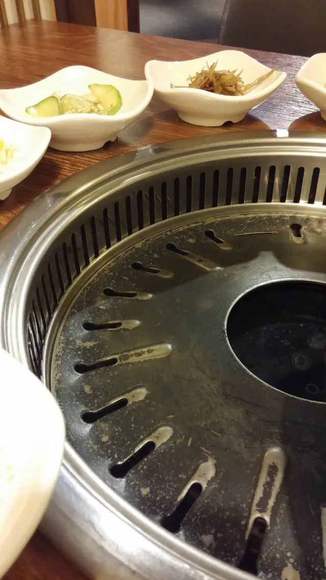 環境頗有舊時韓屋的感覺,主要是因為屏風吧?雖然有得燒烤,但跟常見的設備不同,不是用那從天花板吊下來的抽油煙管。店方指這款爐不需多加花款,旁邊一大堆氣孔就可以洩去油煙。這個是高級得多的版本,沒有那搖搖晃晃的煙管阻礙,不過我們還是沒有烤肉啦。