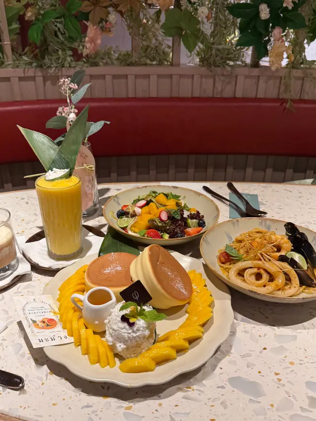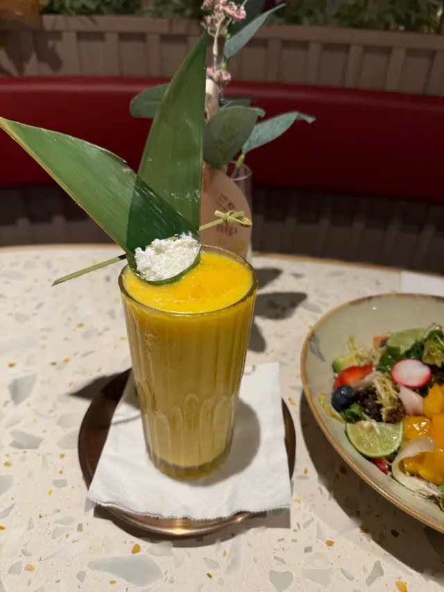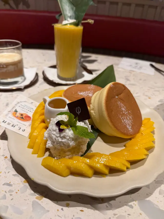 这道真的是灵魂甜品!梳乎厘蓬松得像云朵一样,轻晃盘子还会“duang duang”抖动~切开内层湿润绵密,蛋香浓郁。搭配的芒果肉如同夏天的云朵般轻盈饱满,香甜多汁,再加上软糯的糯米饭和自倒的椰浆,甜度刚好不会腻,一口下去真的仿佛置身泰国。