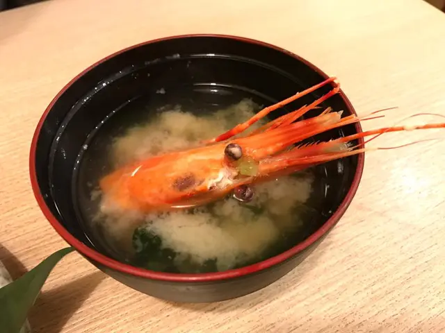 牡丹蝦頭有兩個做法,我選了麵鼓湯的做法,需要另加HK$20。牡丹蝦頭內有頗多膏,麵鼓湯是好喝的,不過喝不出有蝦的鮮甜味,可能是因為時間不夠吧。
