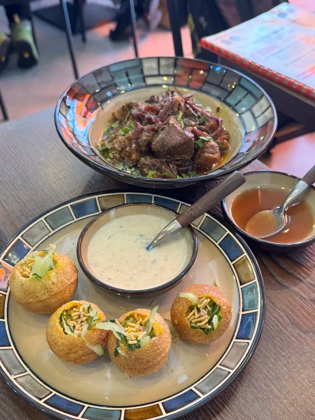 有啲似印度嘅pani puri,脆球卜卜脆,內裡有青瓜粒等配料,食嘅時候可以落酸汁以及乳酪醬,酸酸甜甜幾開胃😙😙