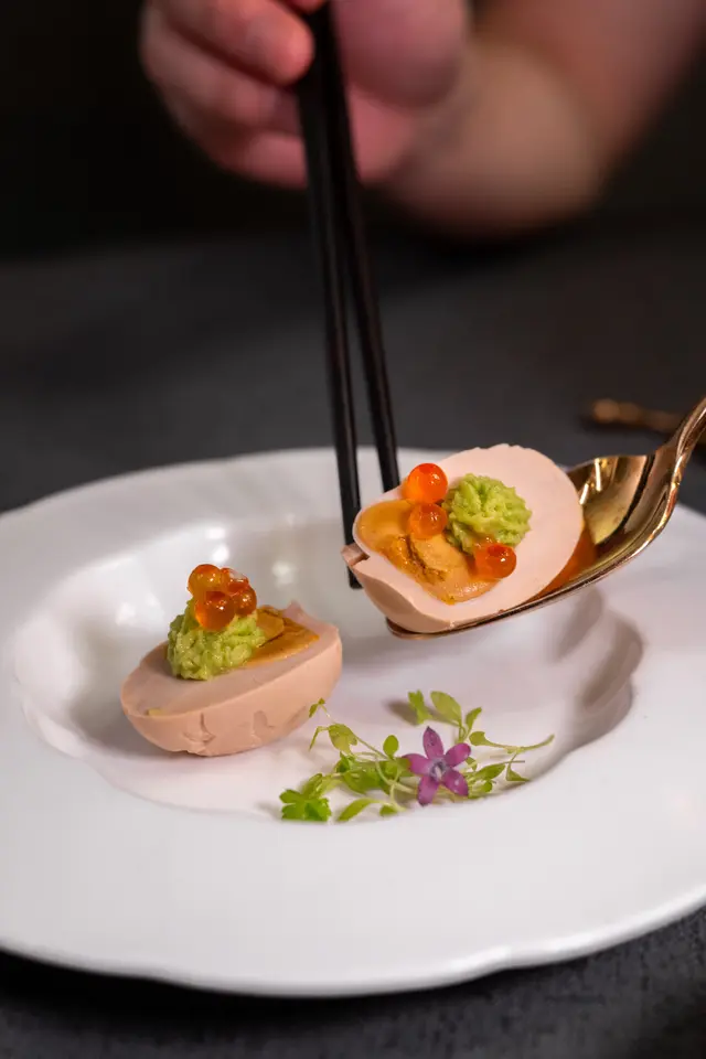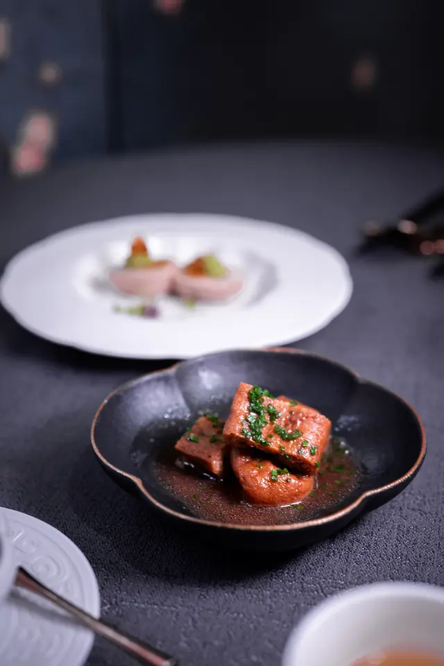前菜中的鮭魚子麻醬雞蛋,蛋香與芝麻香混和,鮮鹹的魚子點綴其中,味道賣相皆見心思;另一道肉汁油豆腐則口感軟滑,掛了清鮮醬汁,作為開場恰到好處。