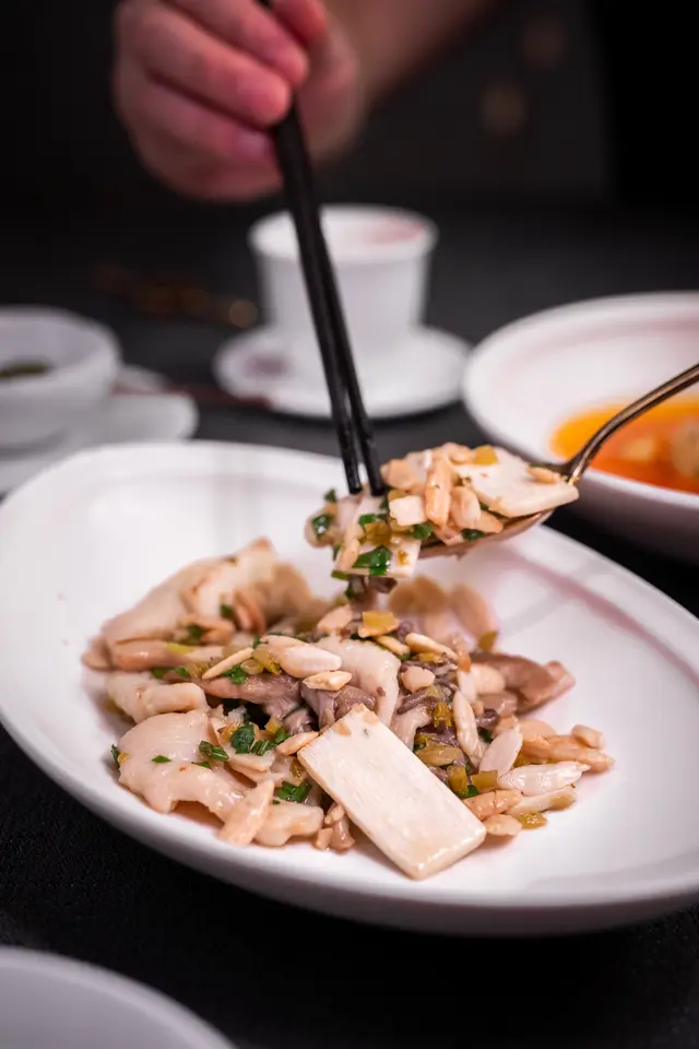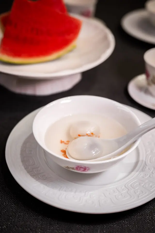 小炒方面有欖仁雪菜炒雞片,雪菜微鹹,襯托雞片的嫩滑,整體頗家常卻細緻;再加一份時蔬,清爽平衡。臨近尾聲,主廚手工包熱騰騰上桌,麵皮柔軟,餡料實在。甜品可以選擇餐廳招牌的寧波湯圓,外皮柔滑煙韌,內餡香甜再加上淡淡的桂花湯收尾。