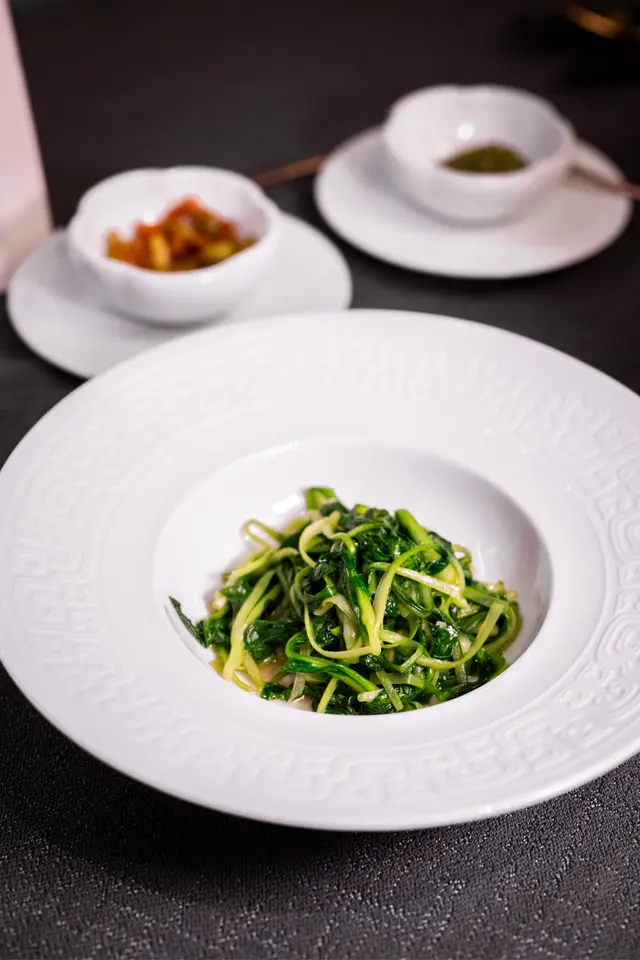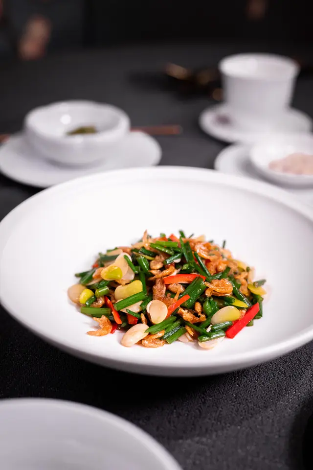 湯羹選了古早肉絲羹,酸甜之間帶微黏口感,暖胃而不濃膩。炸物香酥芋泥雞翅是餐廳的名作之一,頗有特色,外層炸得酥脆,裏頭包著綿滑芋蓉,油香與芋香互相平衡。至於海鮮環節,酸湯熘魚片酸度剛好,加上脆口的米通,湯頭不搶去魚肉的鮮味;韭菜花小雲豆炒冷江白蝦是用蝦米,感覺像小炒王。