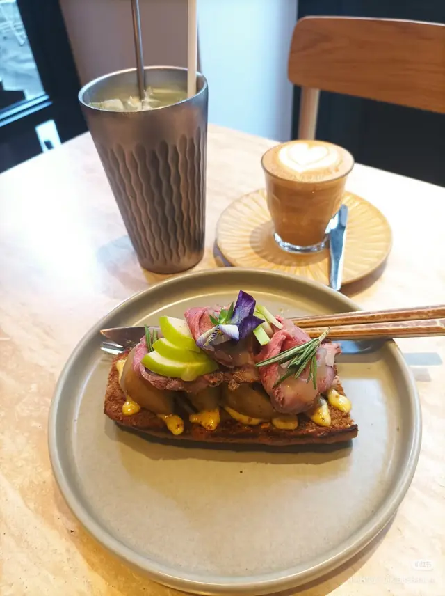 黑麥麵包烘得酥脆🥪,鋪滿粉紅色的慢烤牛肋片🐂,肉質柔軟得用叉子便能劃開。配料方面還有烤薯仔🥔,配搭起來極像一件優雅的藝術品💖
