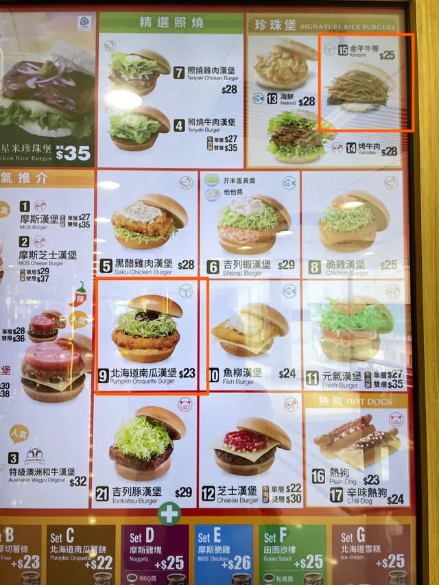 素食有金平牛蒡珍珠堡和北海道南瓜漢堡。