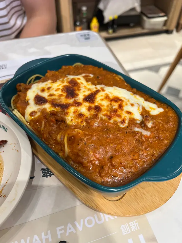 焗肉醬意粉份量十足,啖啖香濃肉醬,厚厚一層芝士拉晒絲,意粉有咬口